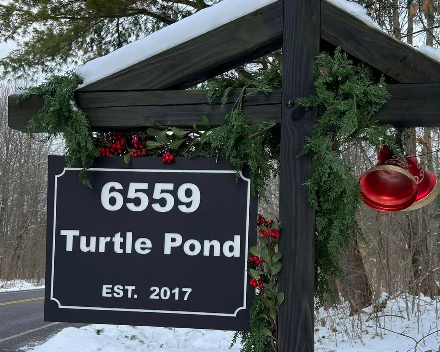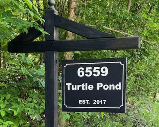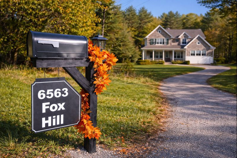 Custom house number and name signs for entry, mailbox, or post. Built for street readability and Rochester weather. Sign only, sign + hardware, or full post & install.